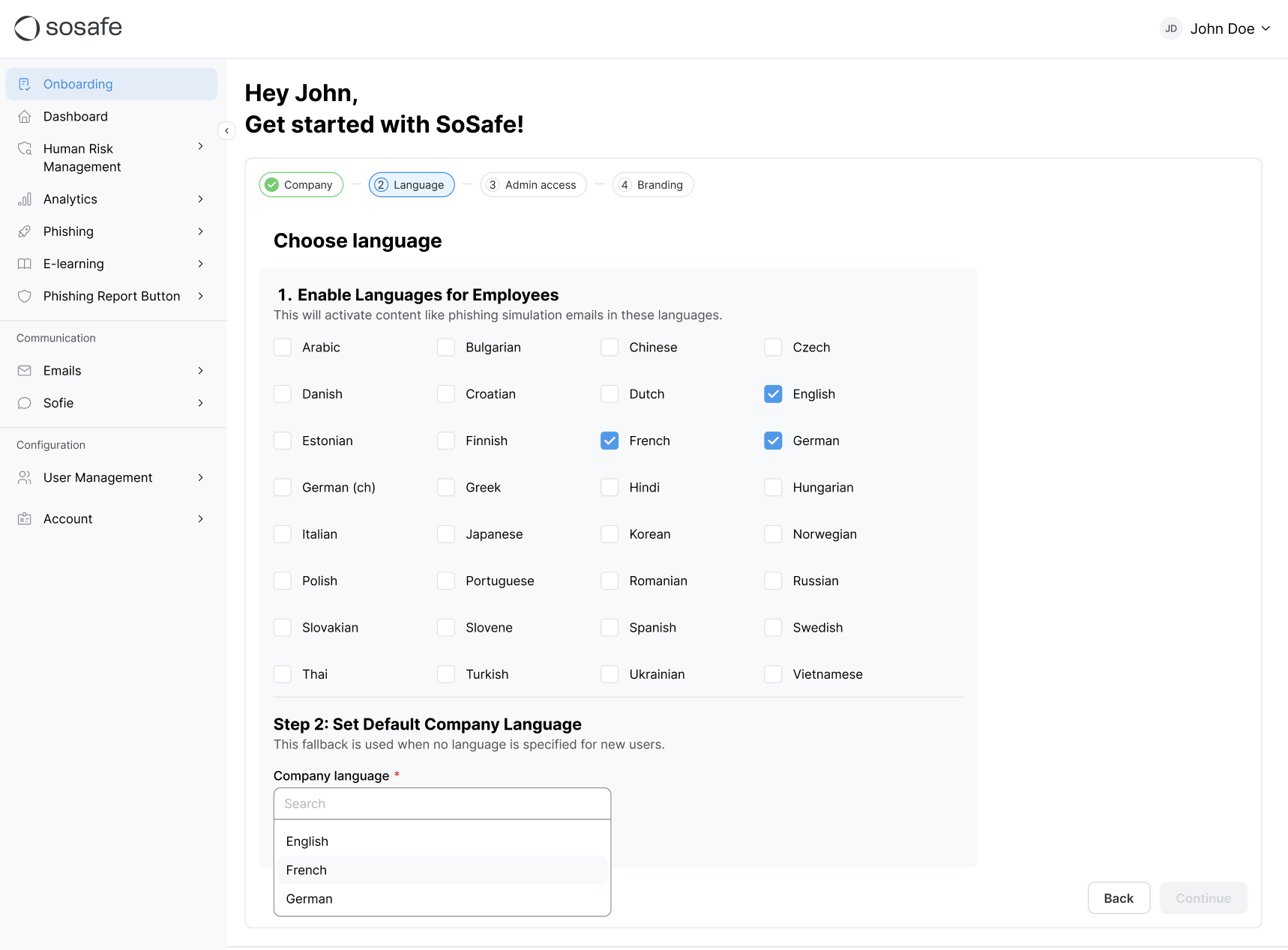 Basic Setup allows you to quickly configure essential settings for your SoSafe account, such as company details, languages, admin users, and branding. By completing this setup yourself, you’ll save time and gain immediate control over your platform’s configuration.