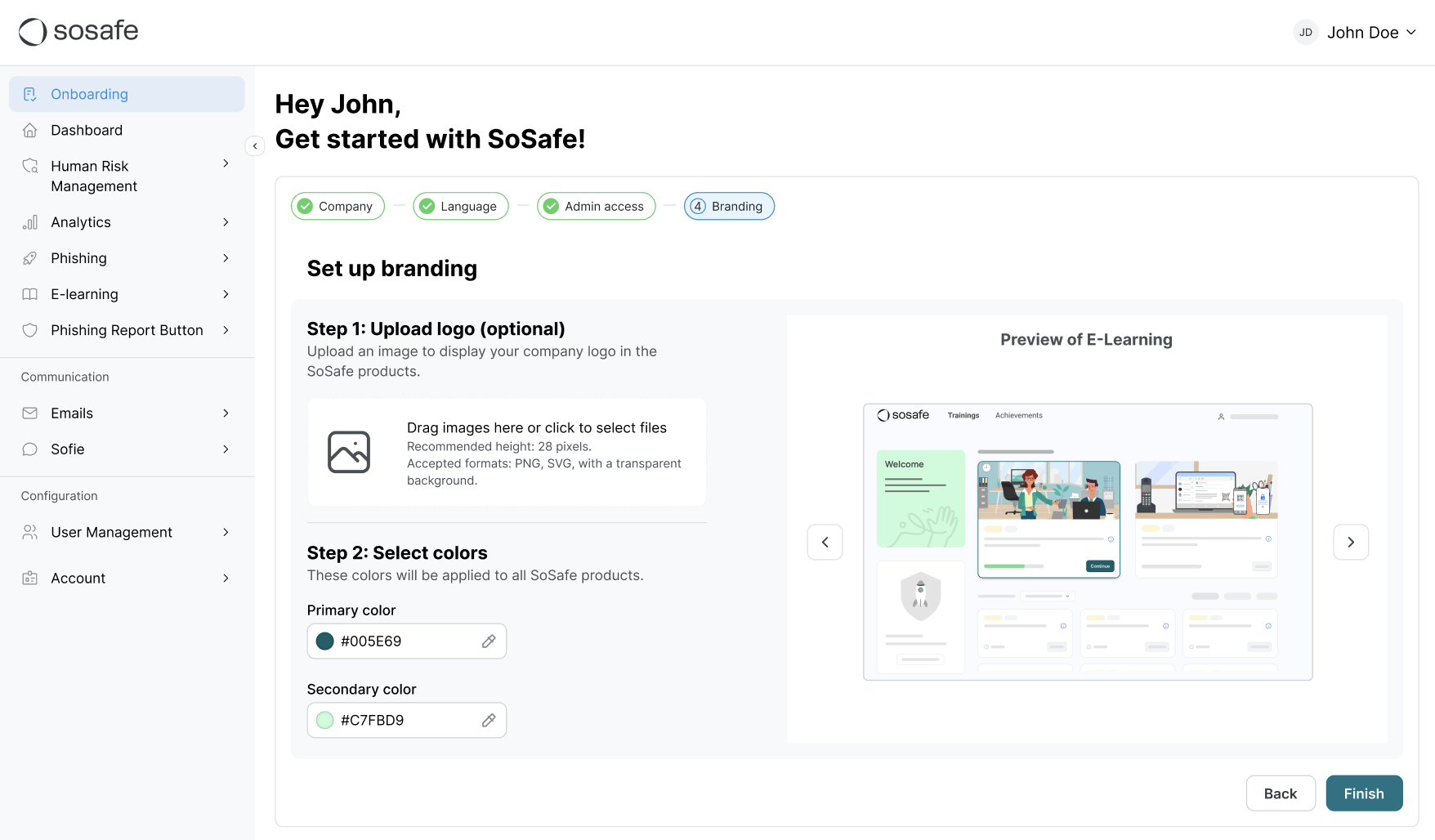 Upload your company logo and set your brand colors to customize the look of SoSafe’s platform.