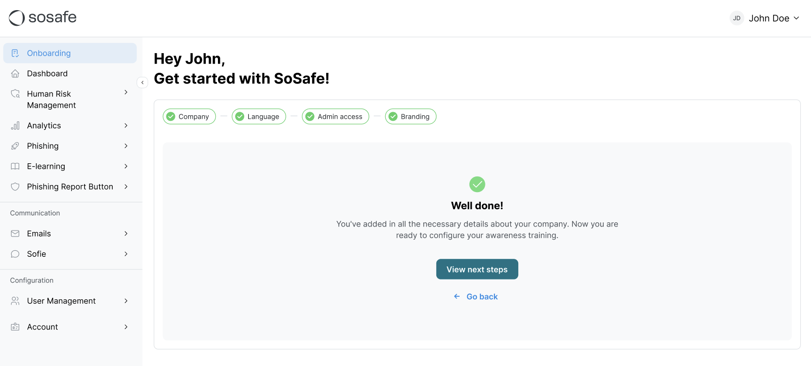 Basic Setup is a simple, step-by-step wizard available under the Onboarding menu in your SoSafe Manager. Once completed, you’ll be ready to start your training campaign.