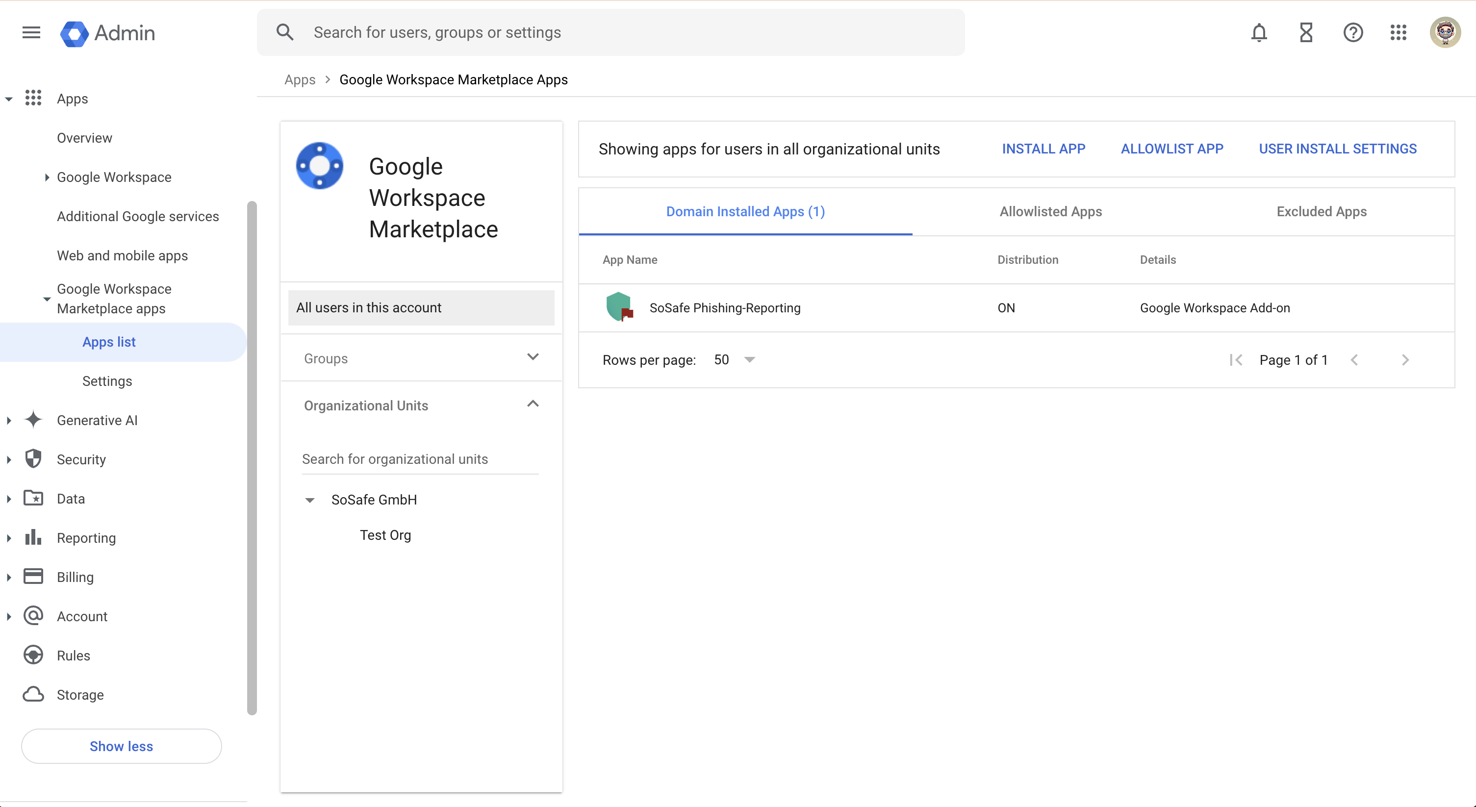 Go to SoSafe Phishing-Reporting in the Google Workspace Marketplace. Select Install.