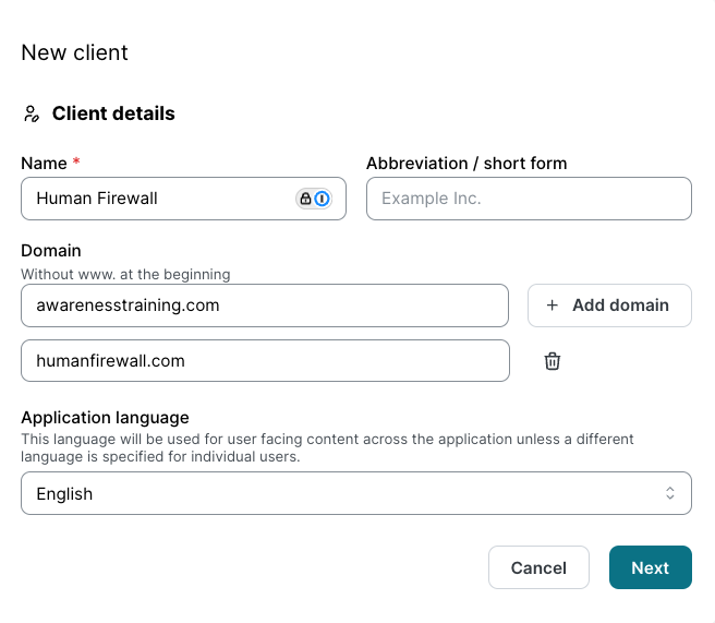 Enter the client name: this will be the client’s unique identifier across the platform and must be unique. The client’s name will also be used in the billing details.