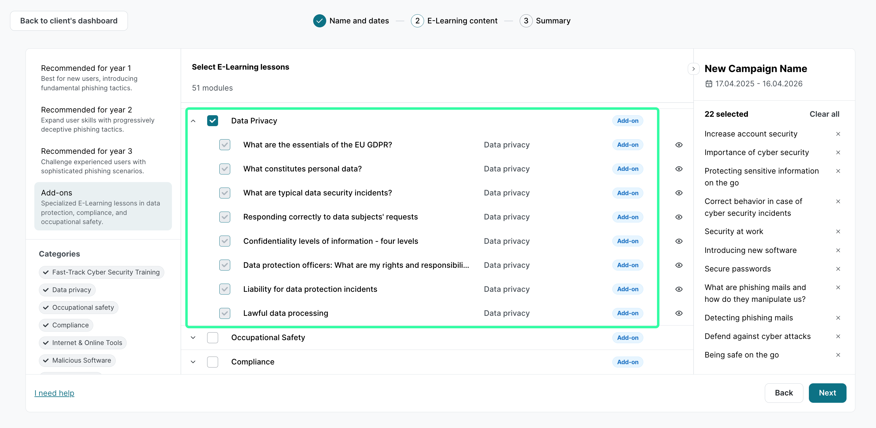 If Add-ons have been purchased, they will also be available for selection on this awareness training.