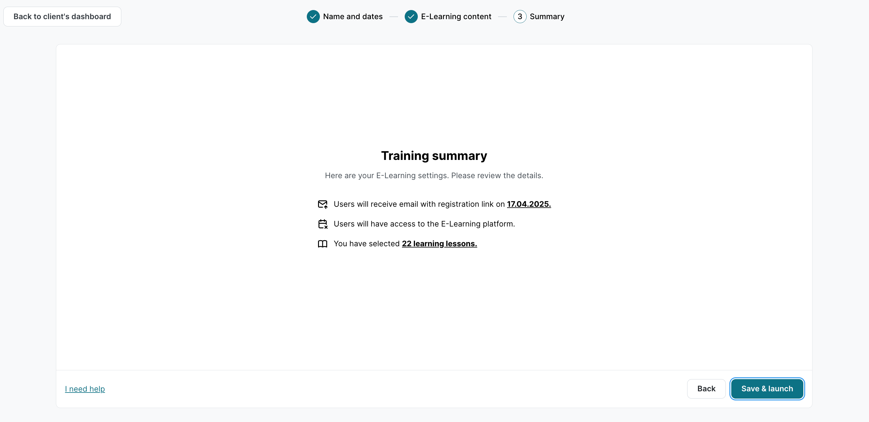 On the Training summary page, click the Save & launch button to make the E-Learning training changes effective.